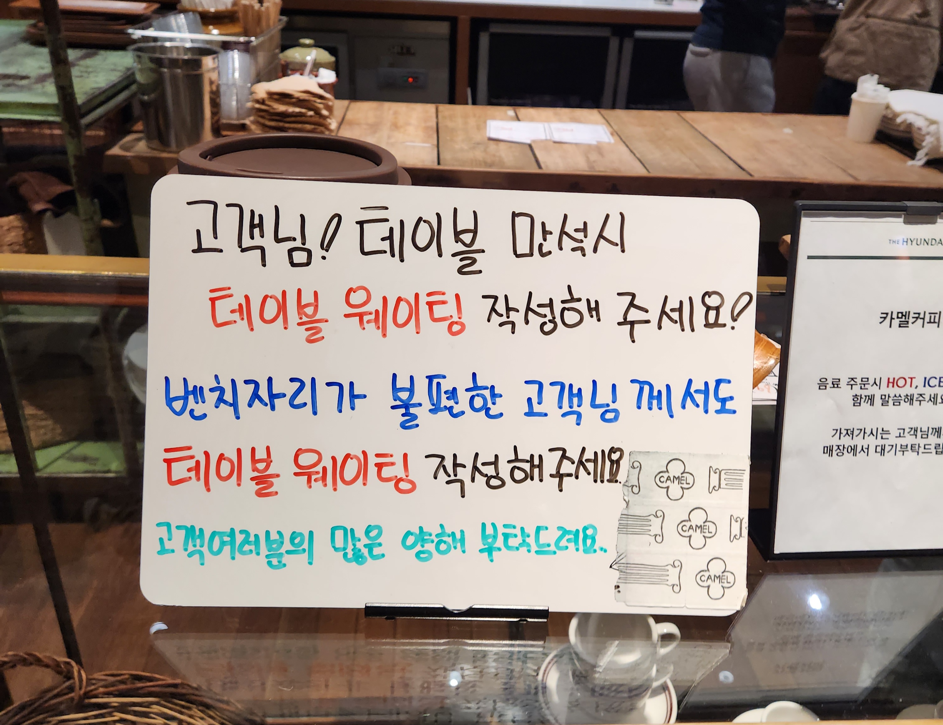 카운터 앞에 테이블 웨이팅 안내문도 적혀있다.