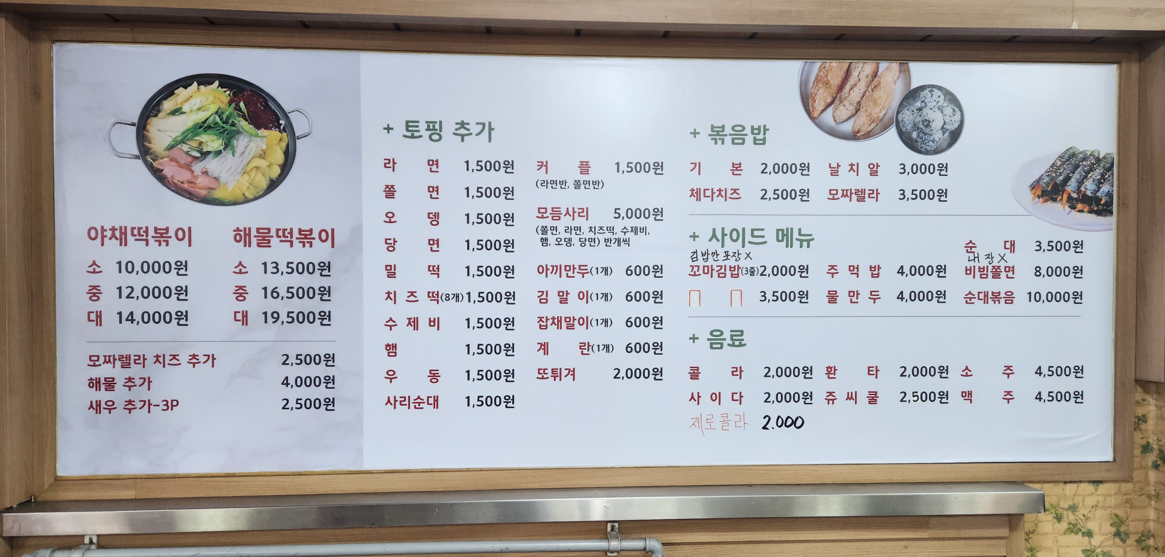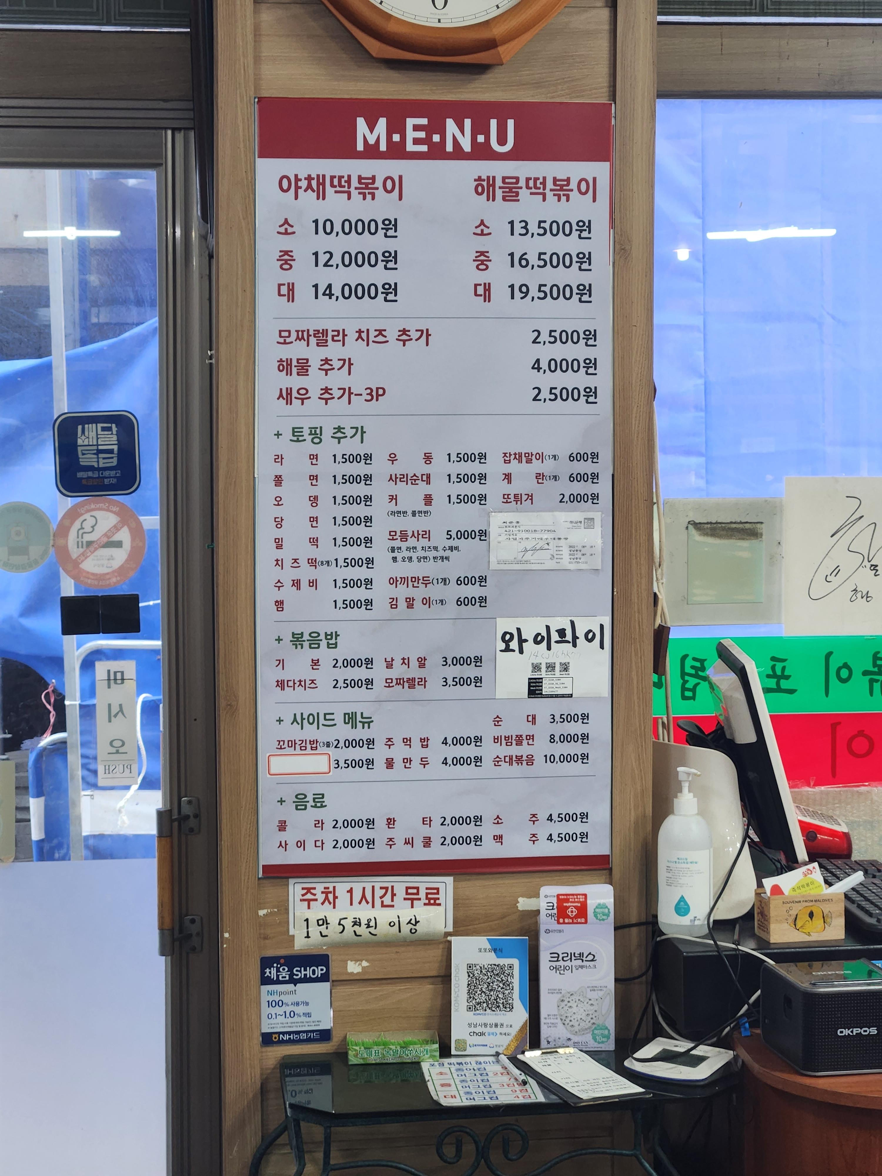 메뉴는 야채떡볶이, 해물떡볶이가 있고
