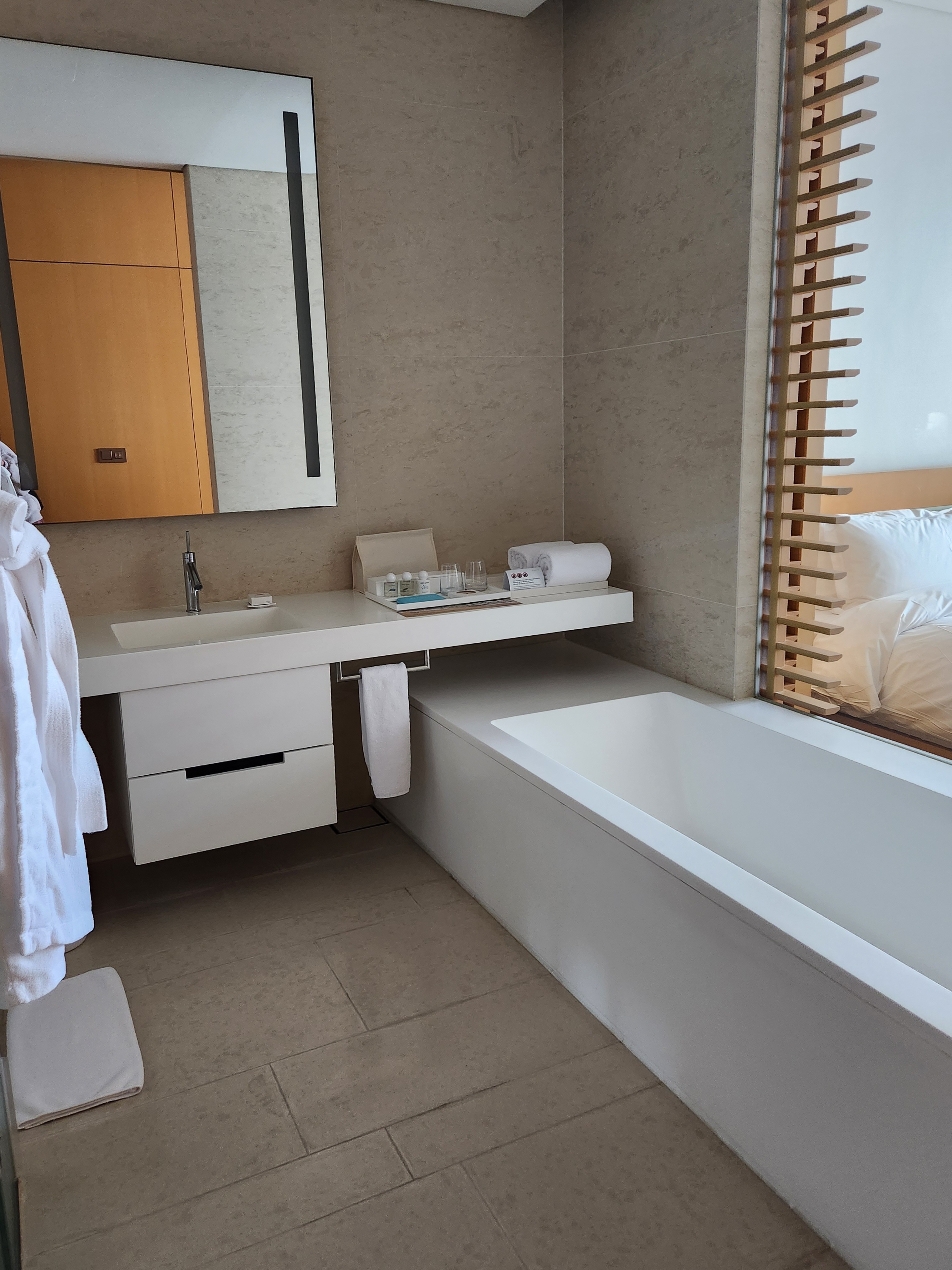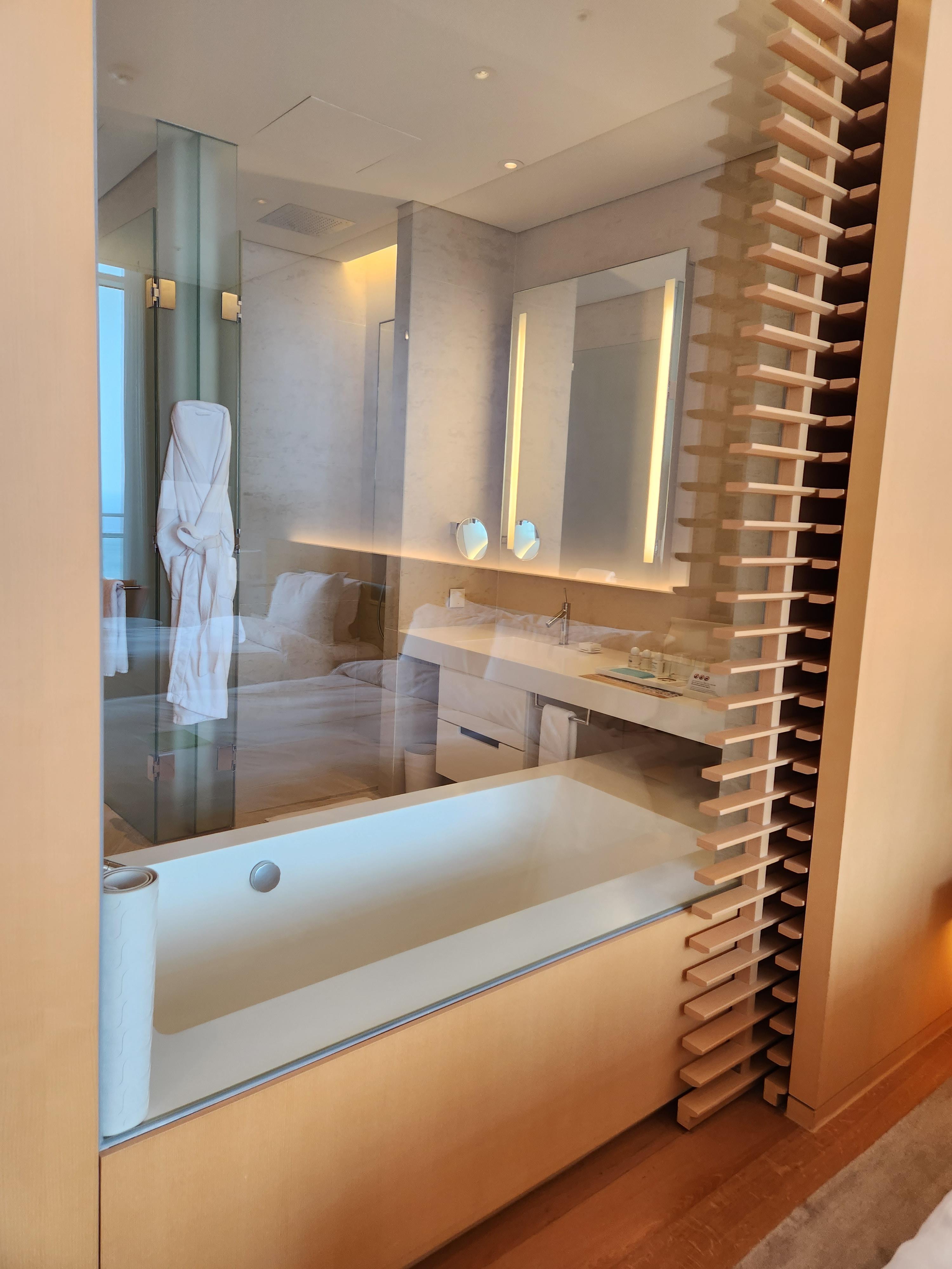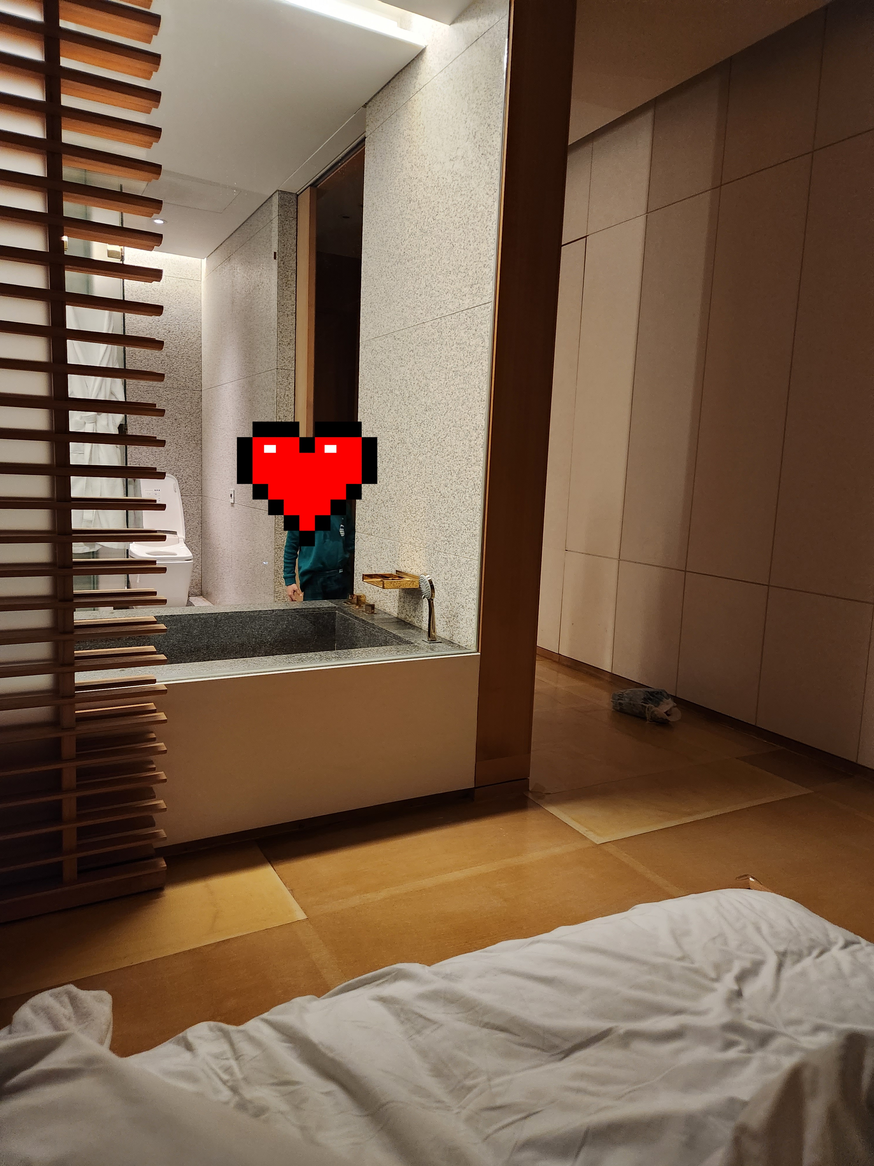 욕실과 룸 사이에 우드 블라인드가 설치되어 있다.