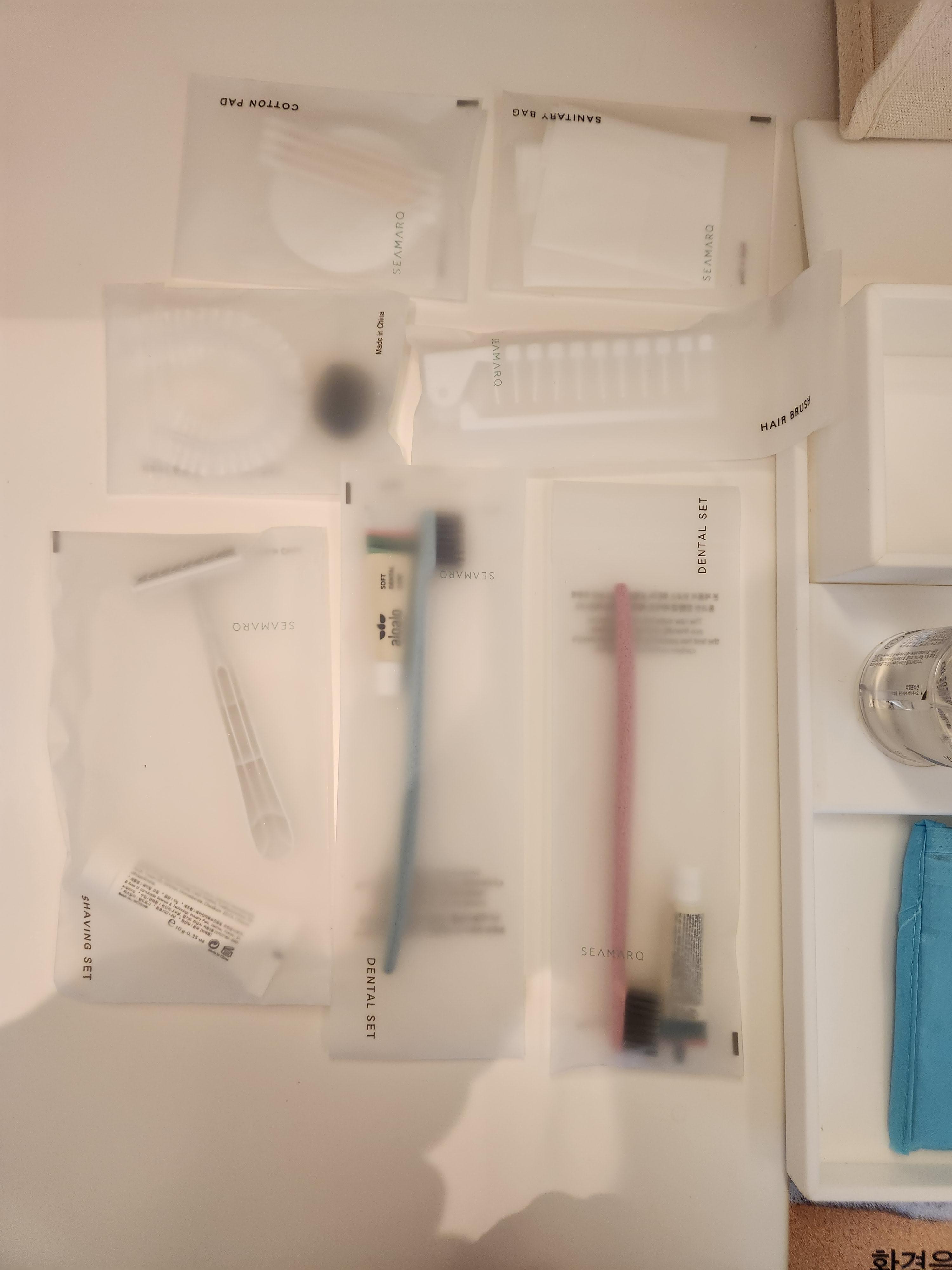 론드리백, 컨디셔너, 치약, 칫솔, 빗, 면도기