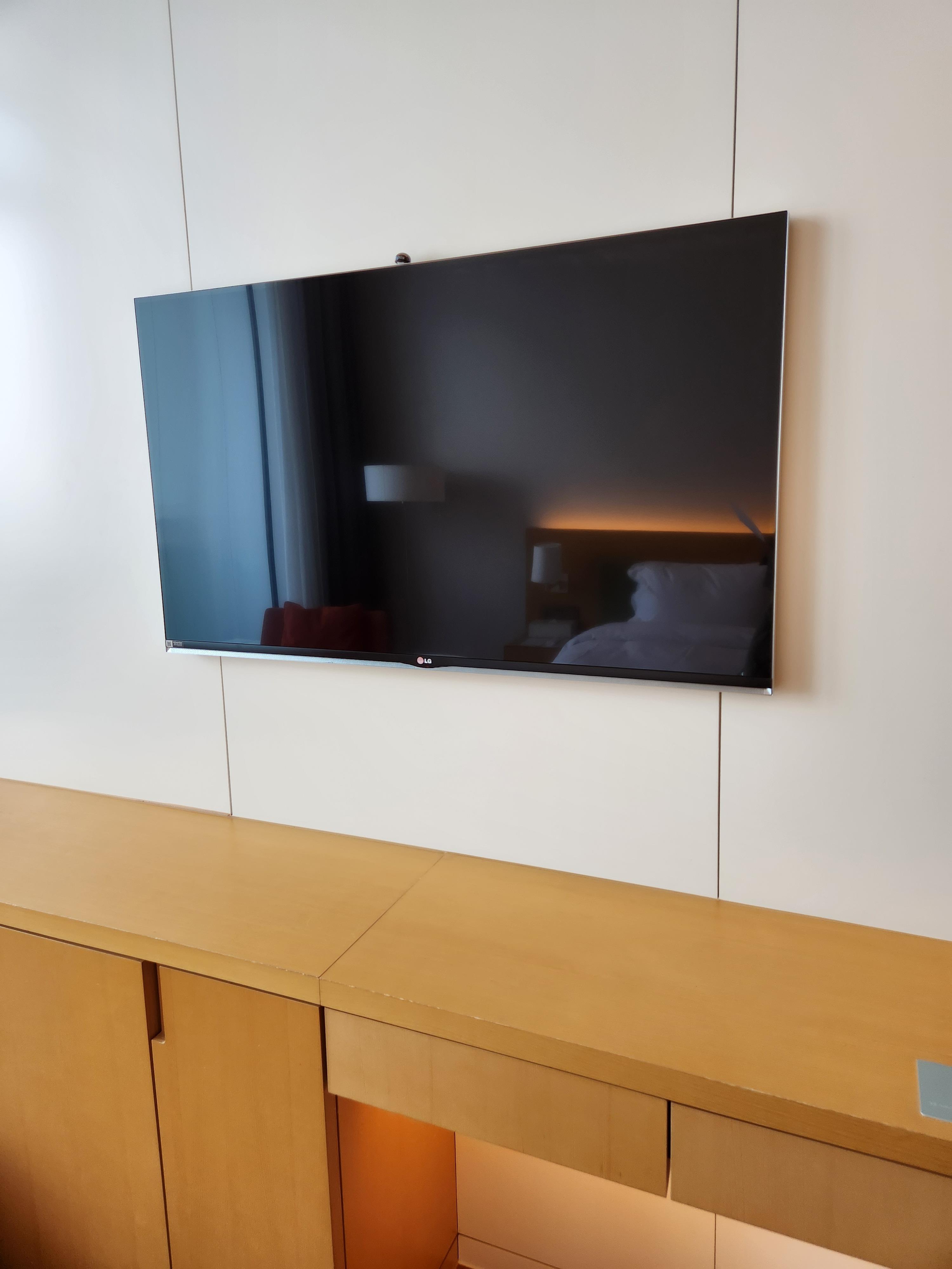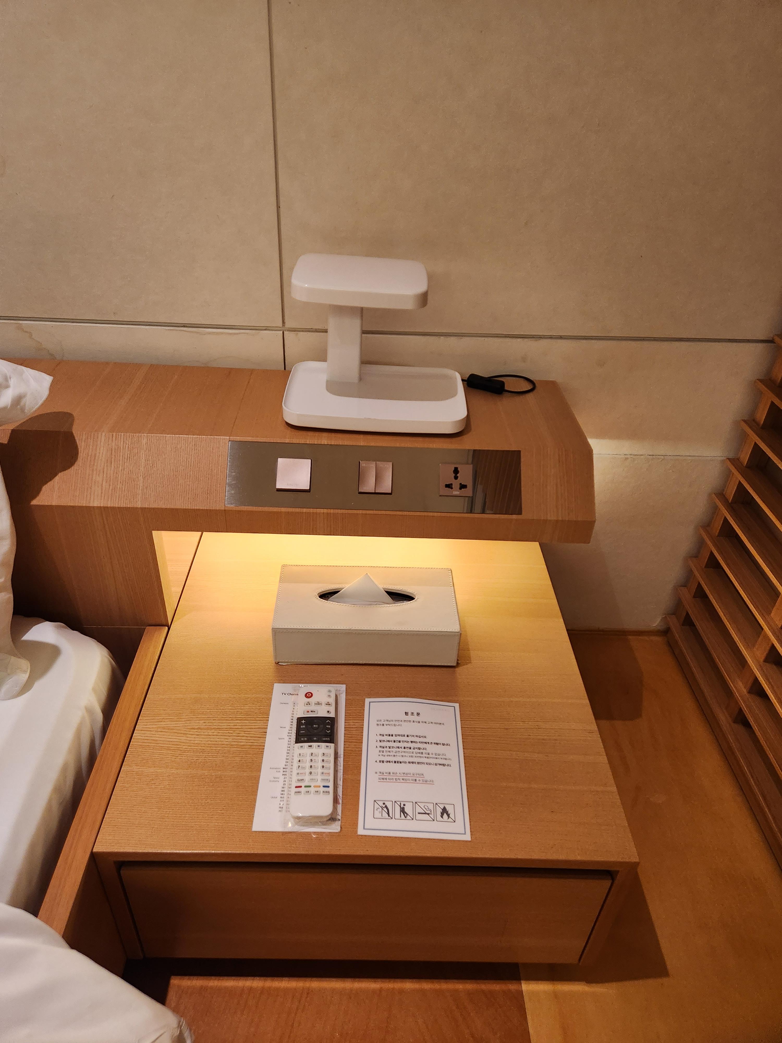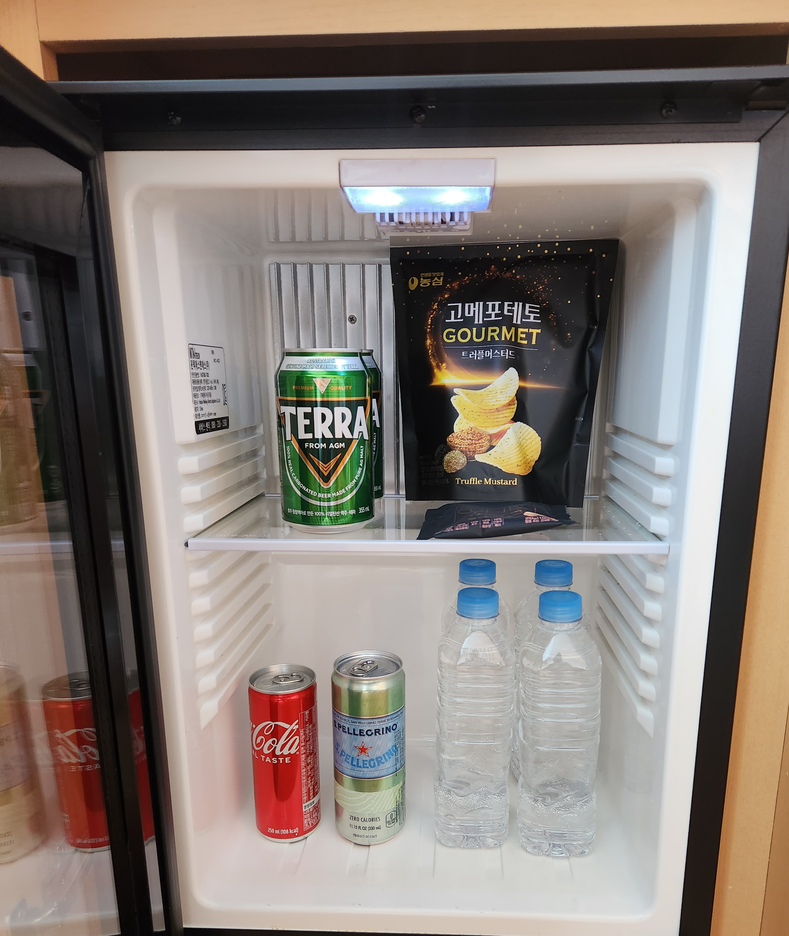 객실에는 소파와 테이블, 책상, TV, 냉장고, 미니바