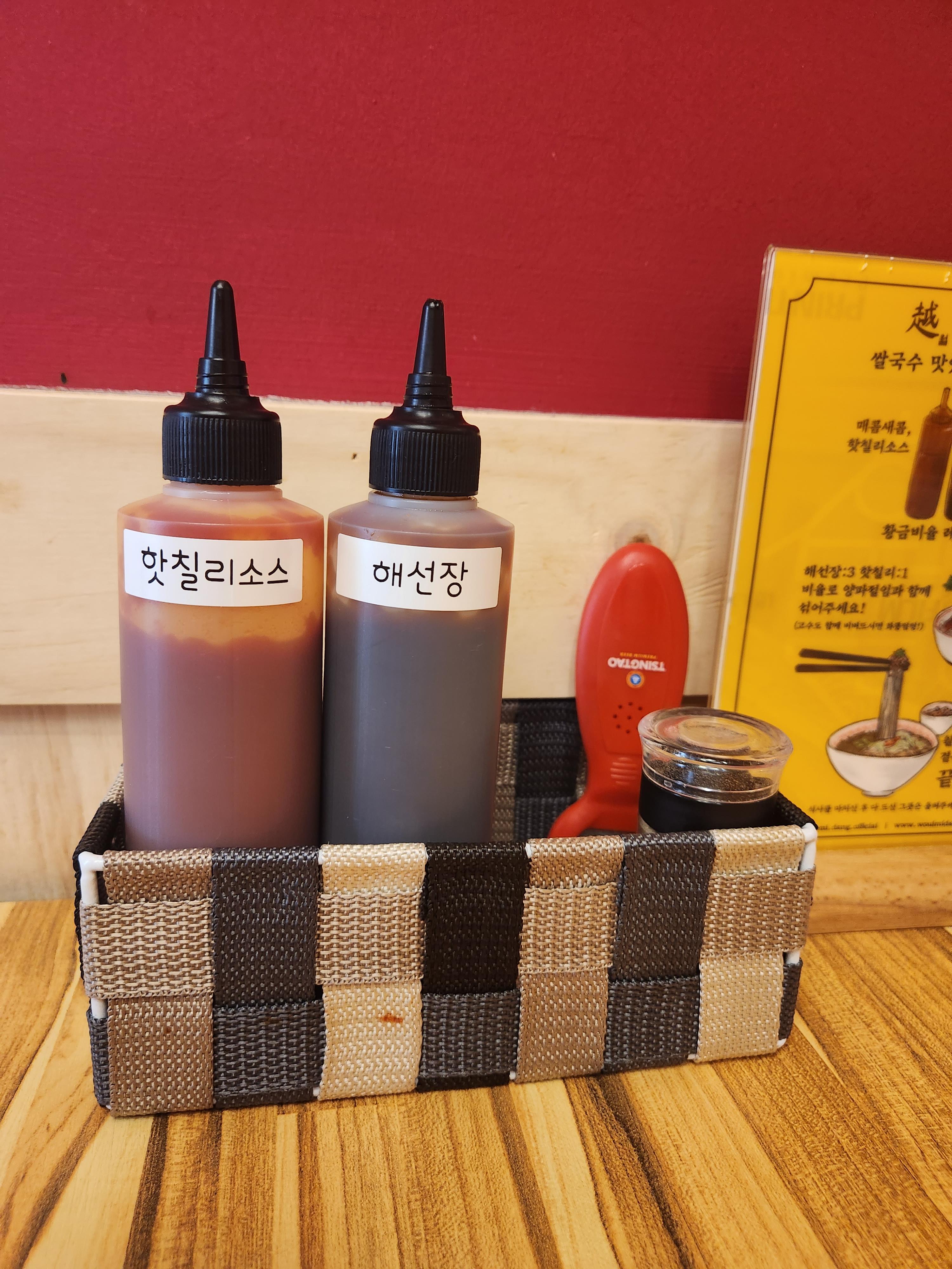 핫칠리소스, 해선장, 후추가 놓여 있다.
