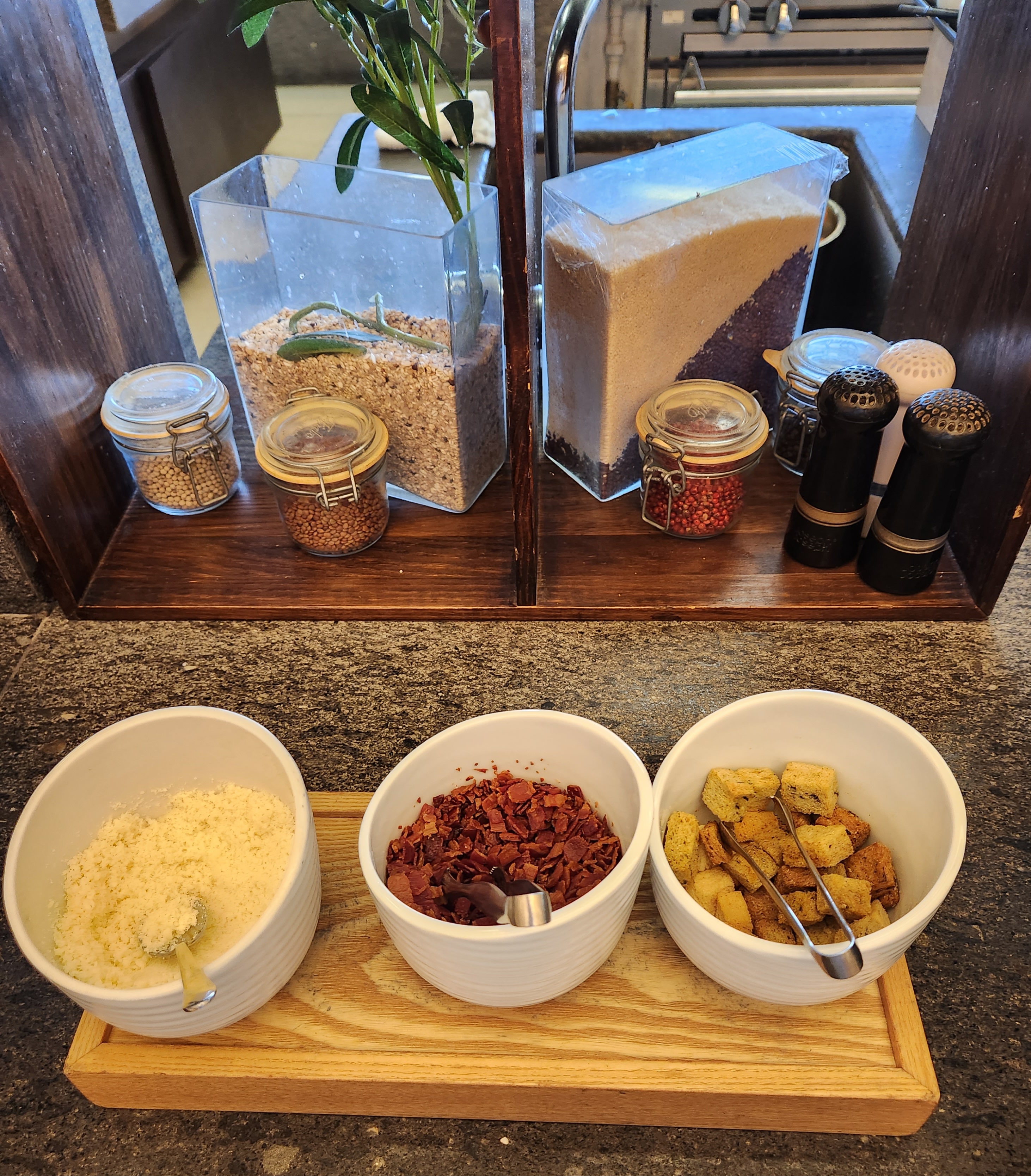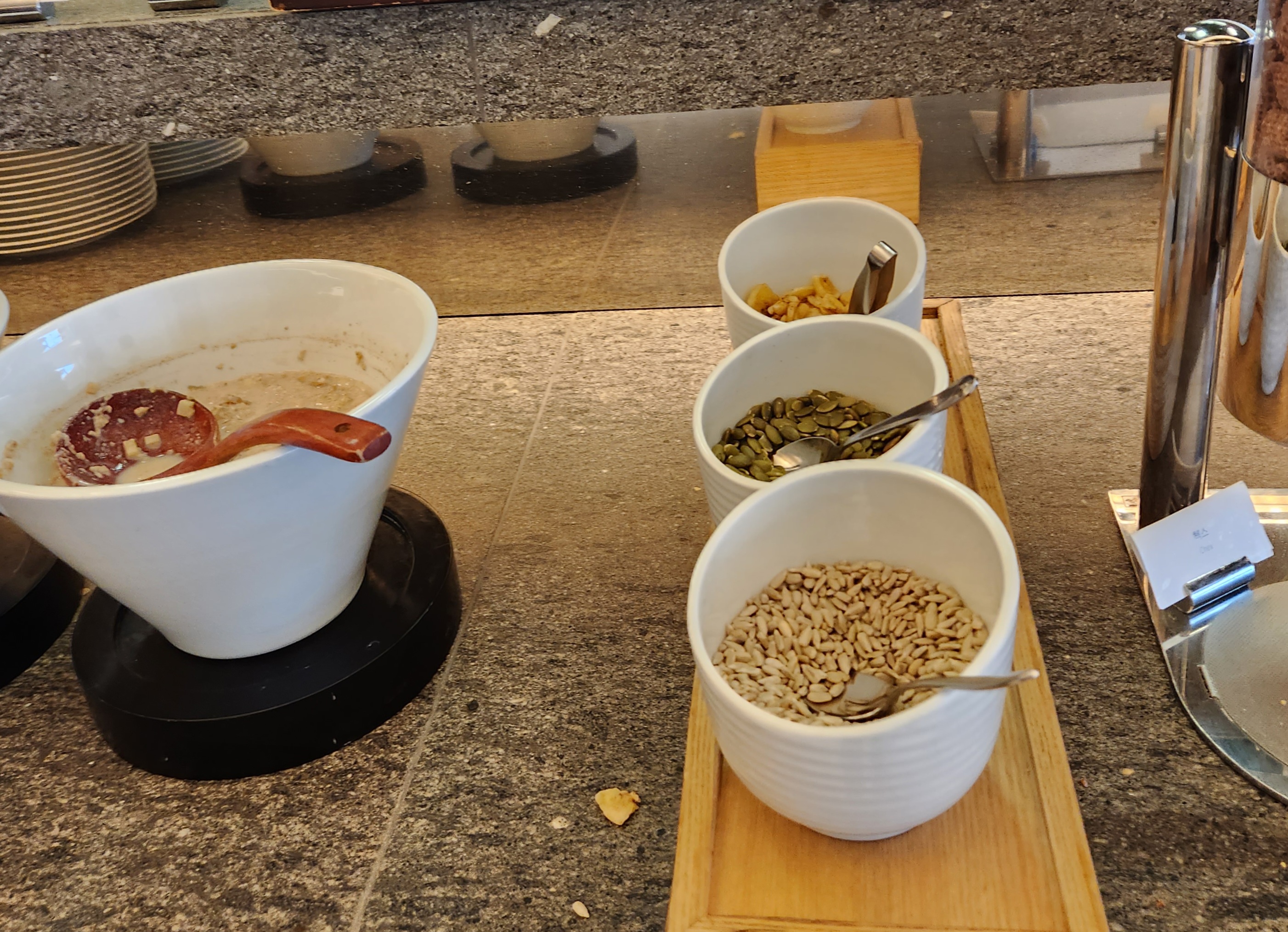 토핑으로 해바라기씨 잣, 호두가 비치되어 있다.