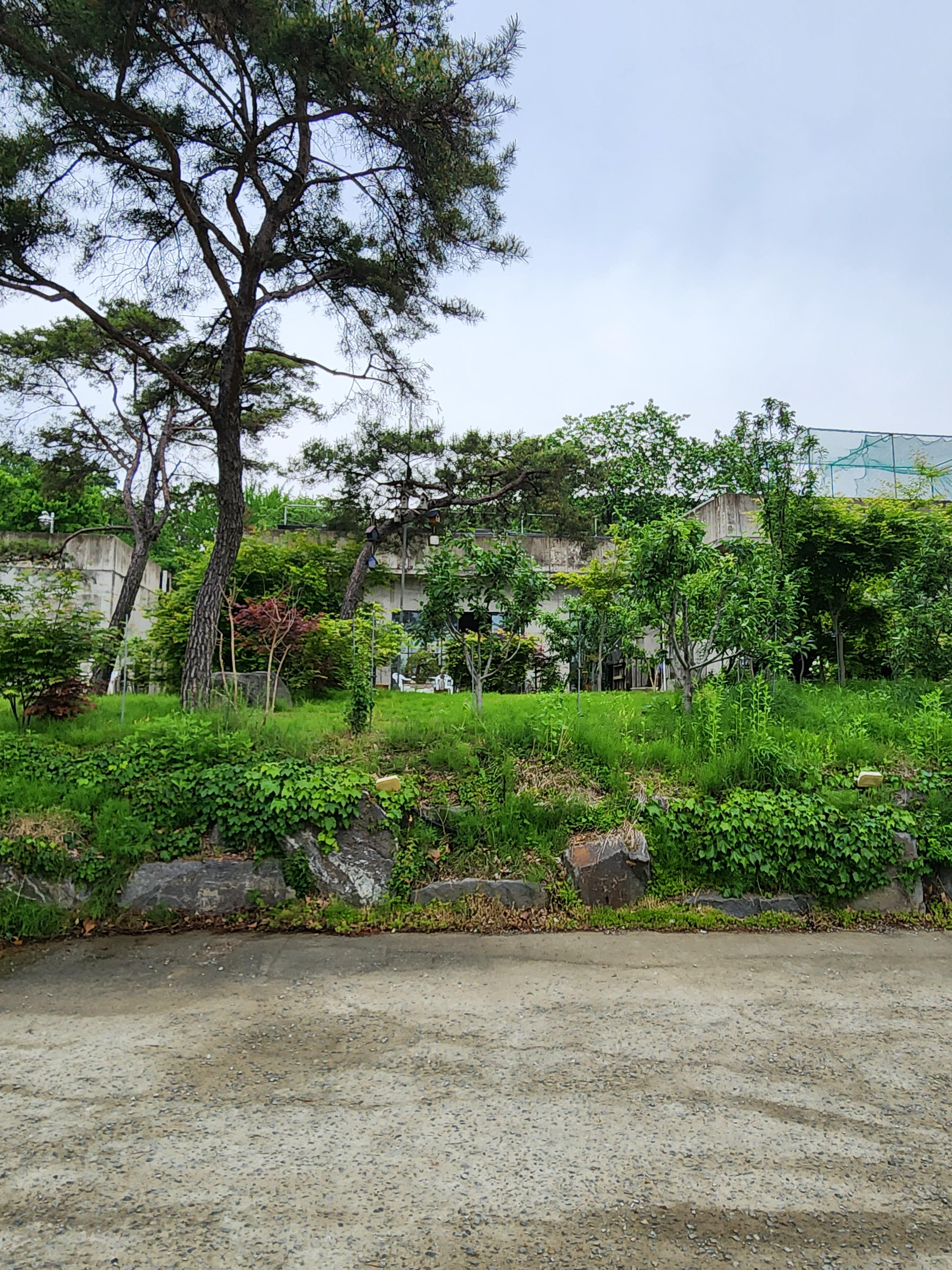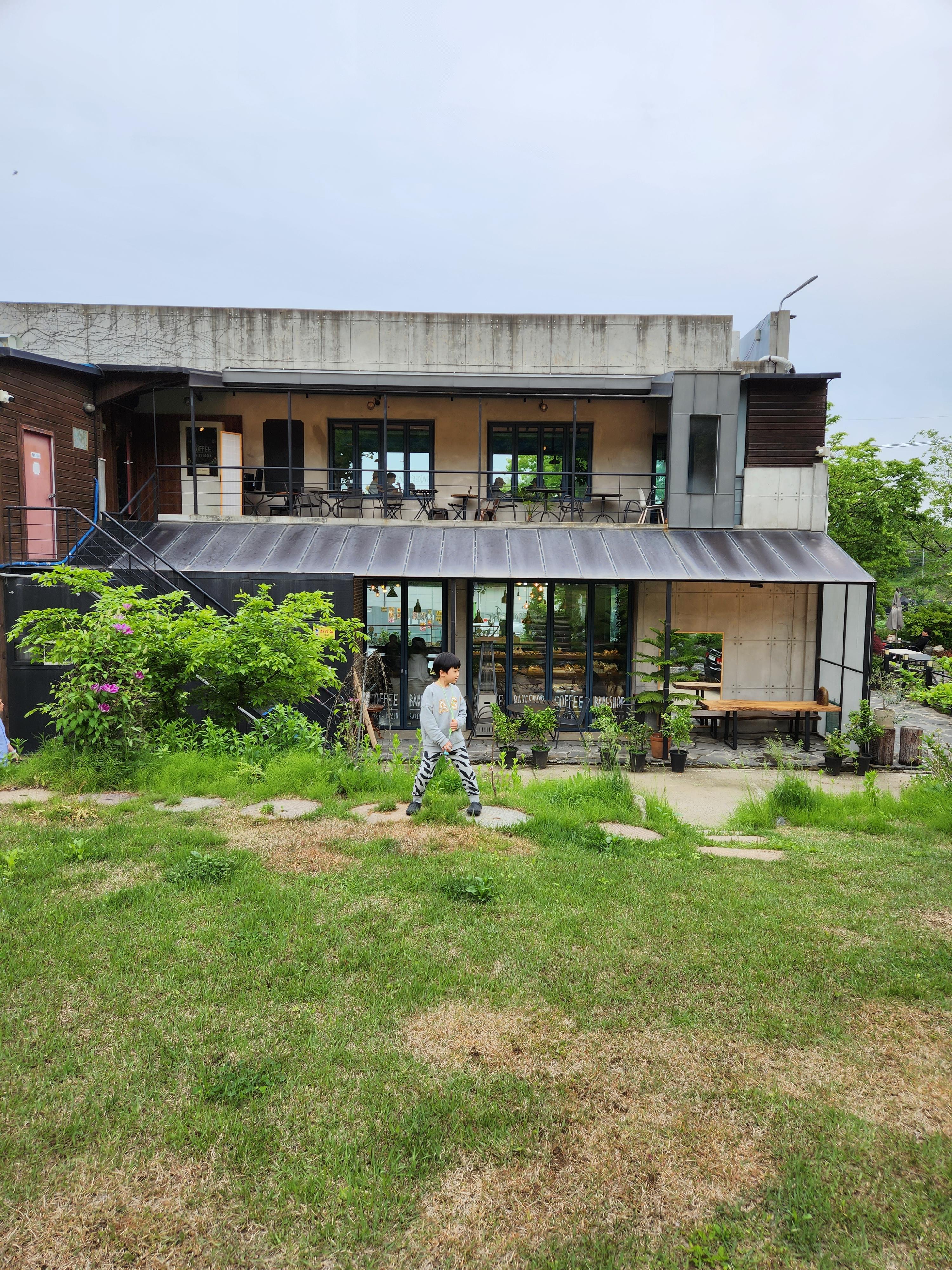 카페 뒤에서 바라본 모습이다. 넓게 잔디가 있고 그 뒤에
