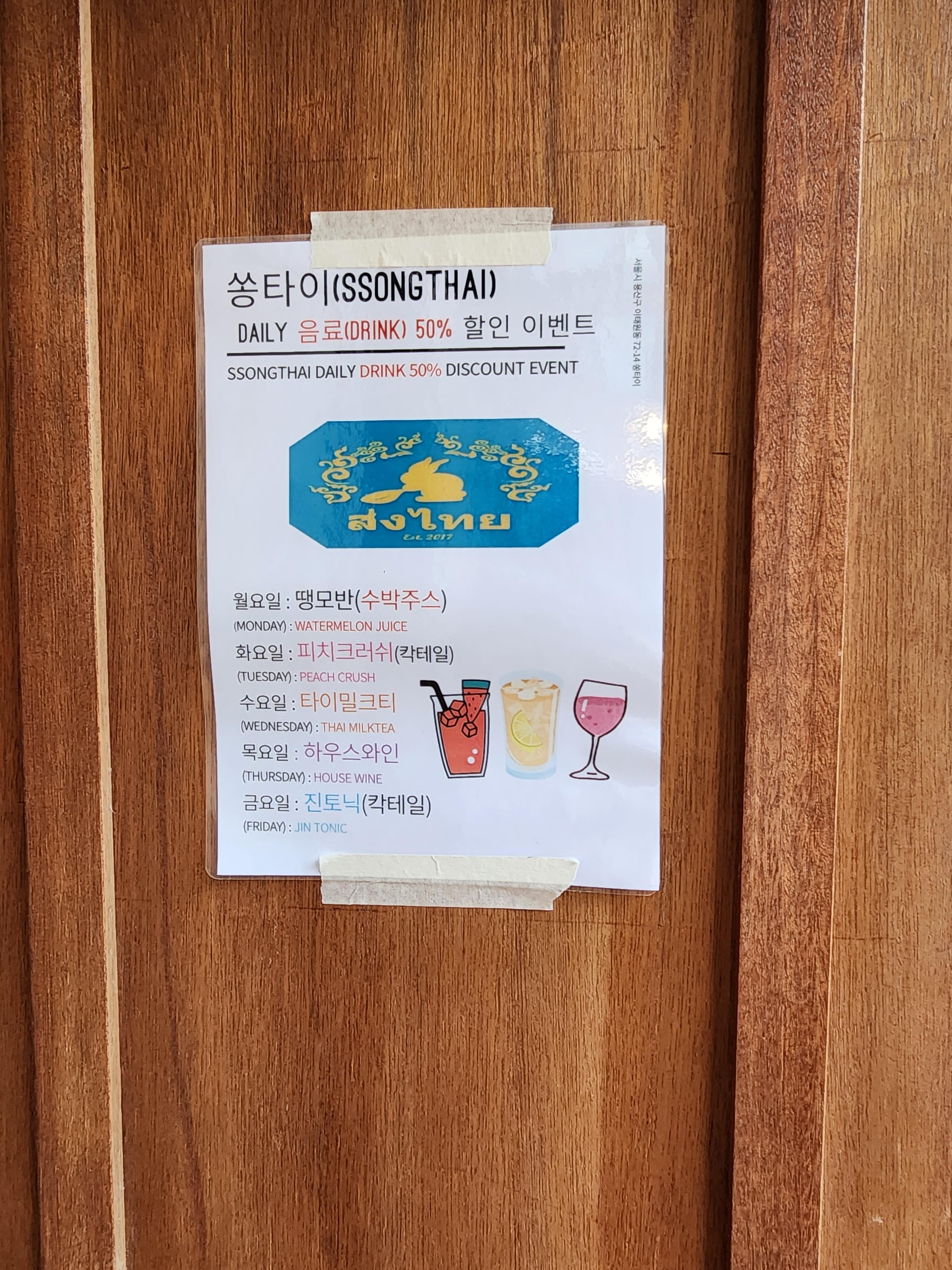 쏭타이는 요일별로 음료 50% 할인 이벤트를