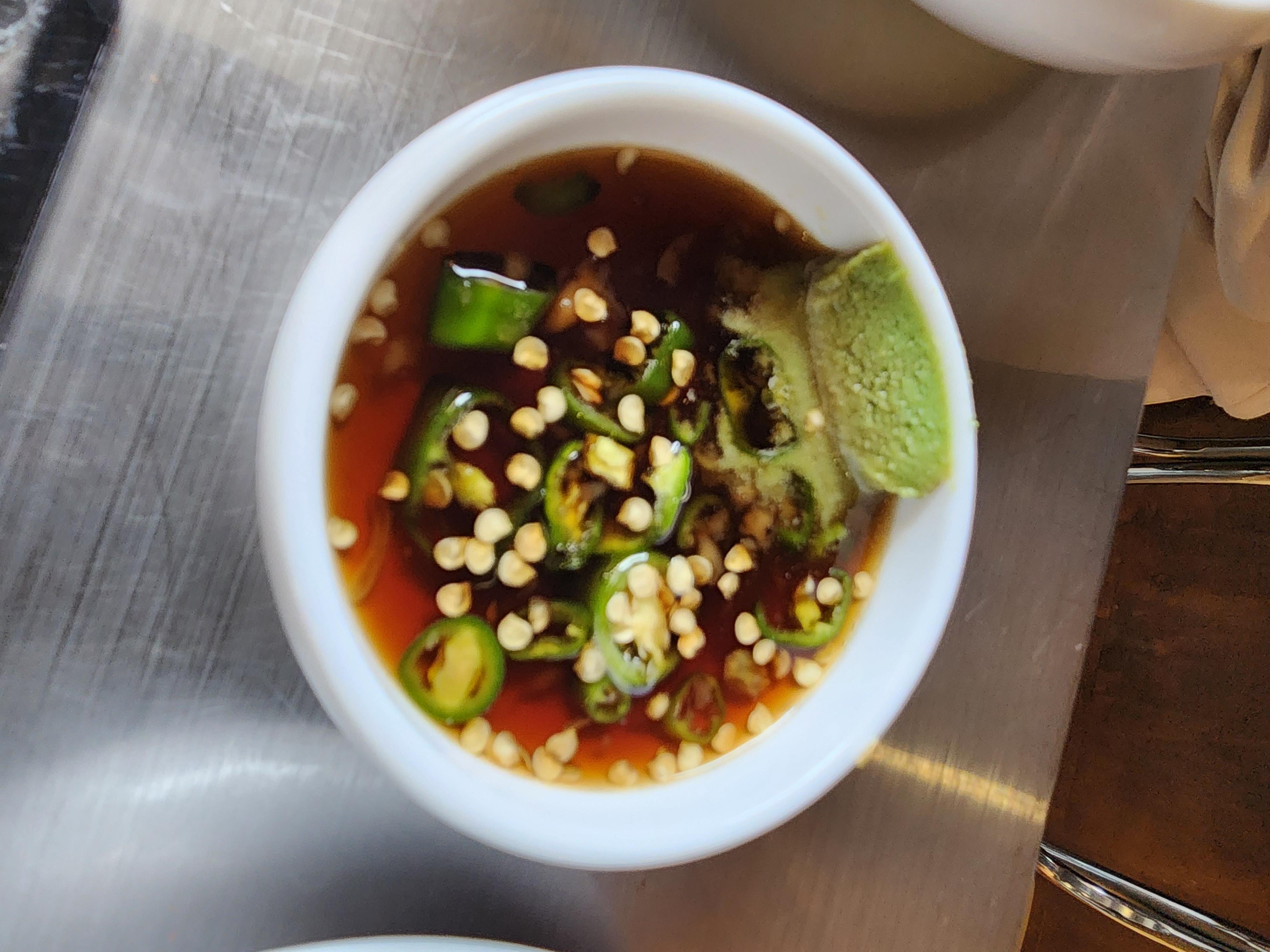 구운 대창과 곤이먼저 고추냉이청양소스에 콕 찍어먹으니