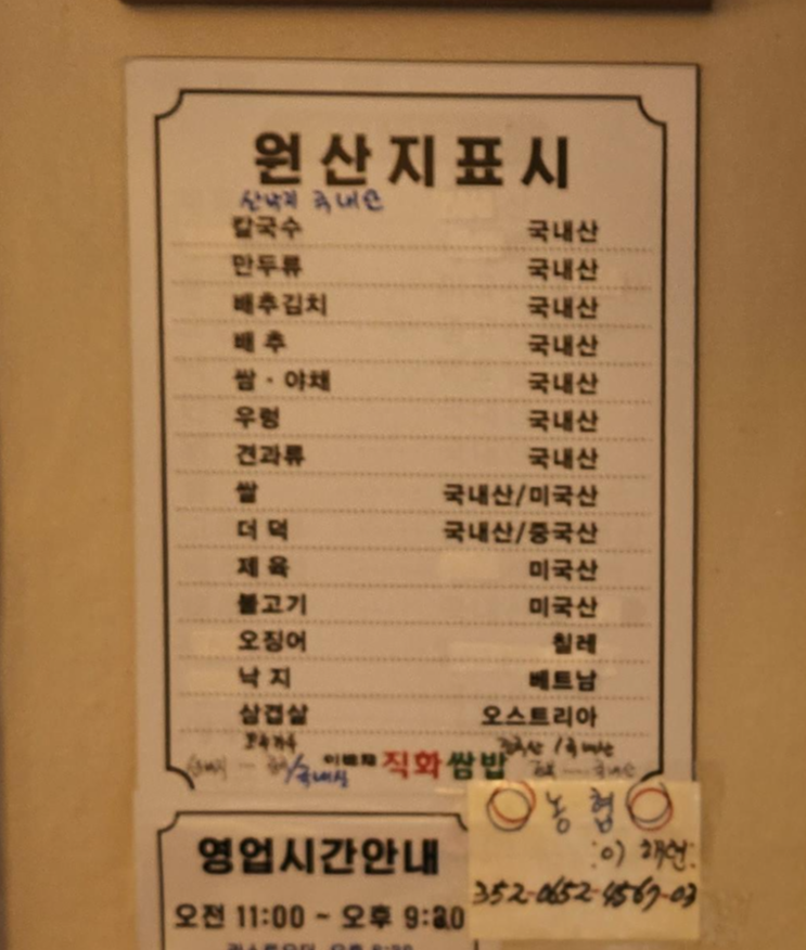 산낙지, 배추김치, 쌀, 우렁은 국내산