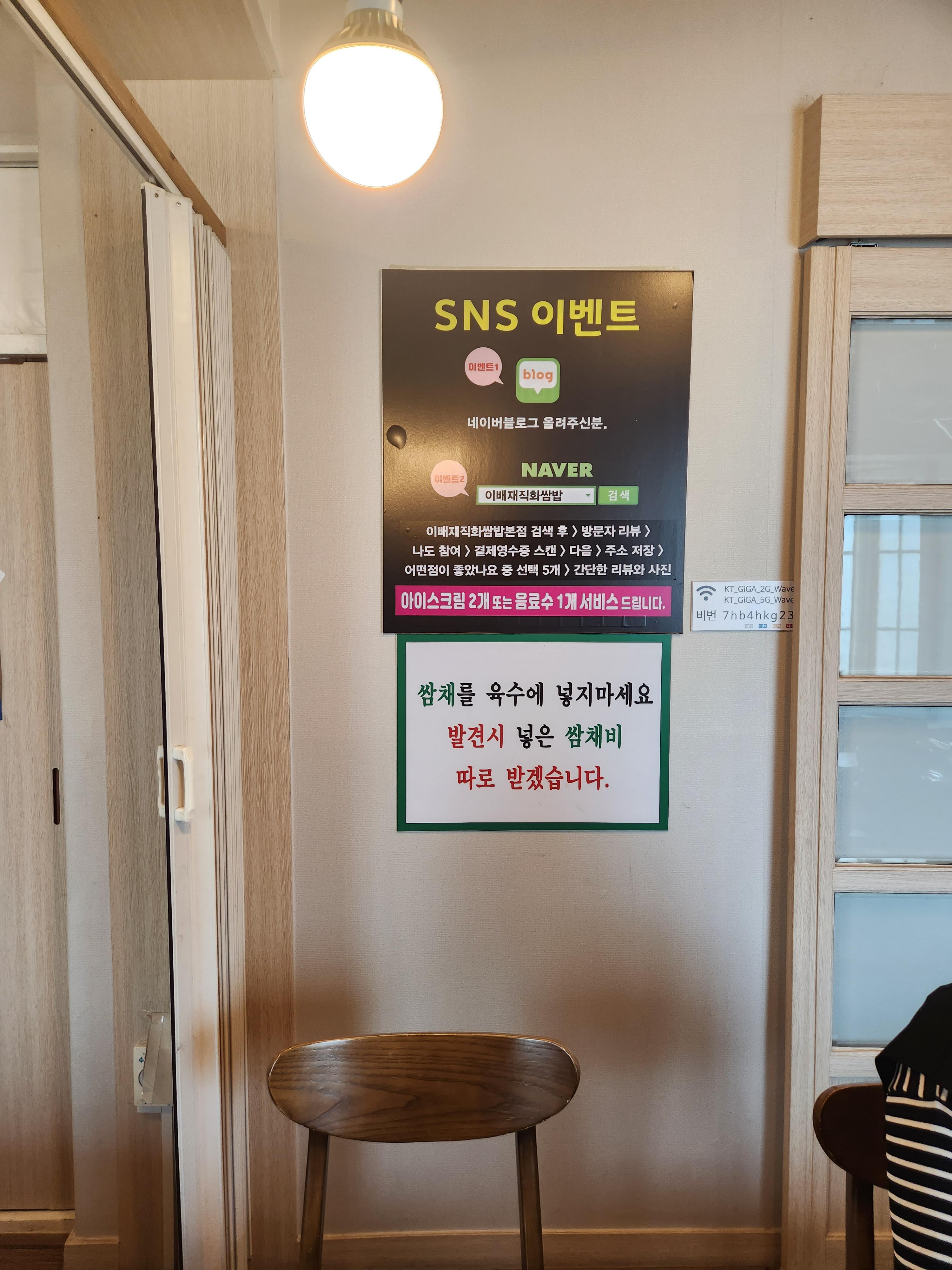 배추김치, 우렁쌈장, 고추&마이 제공된다.