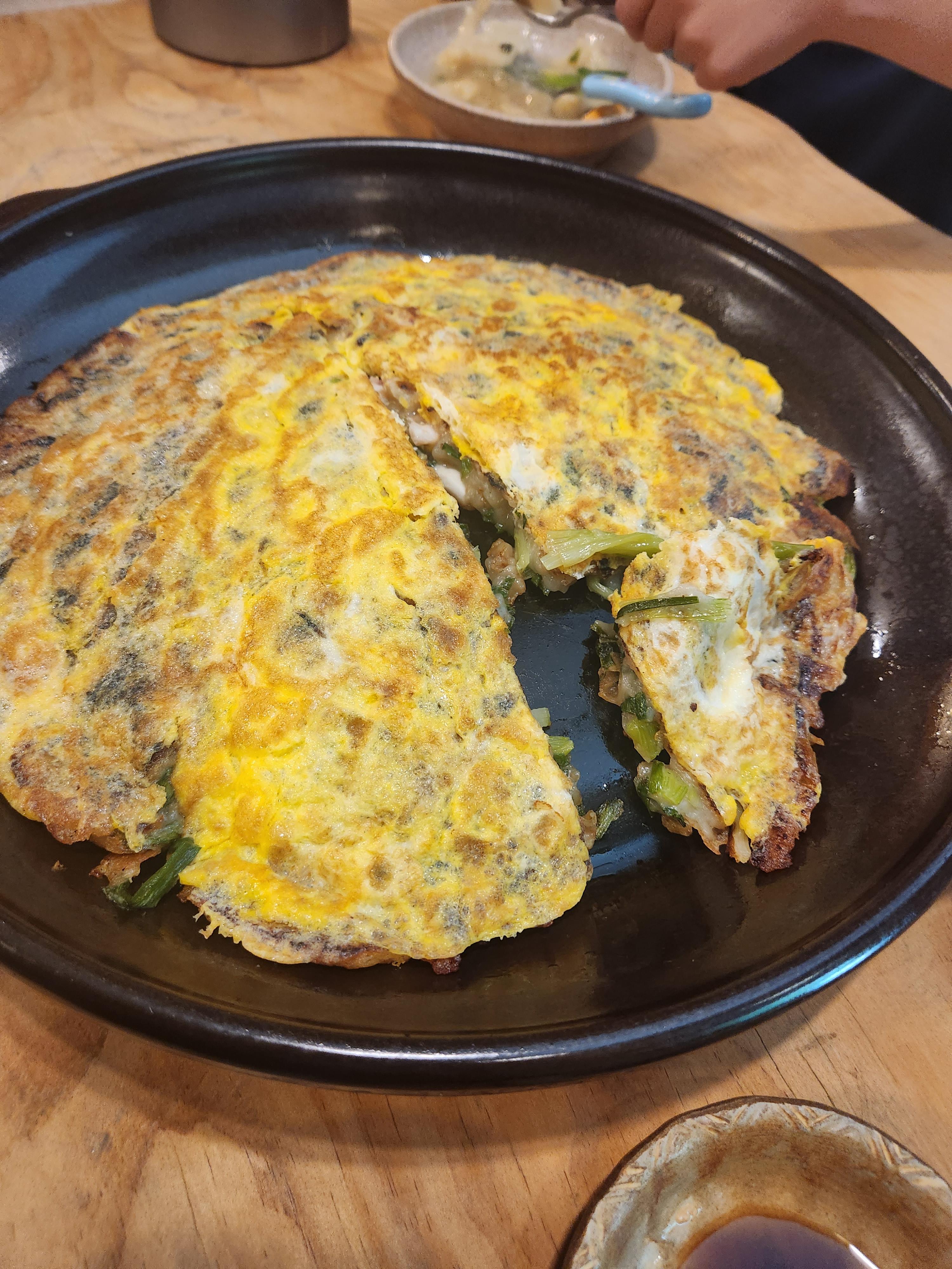 그릇이 데워져 나와 따뜻한 파전의 온도를