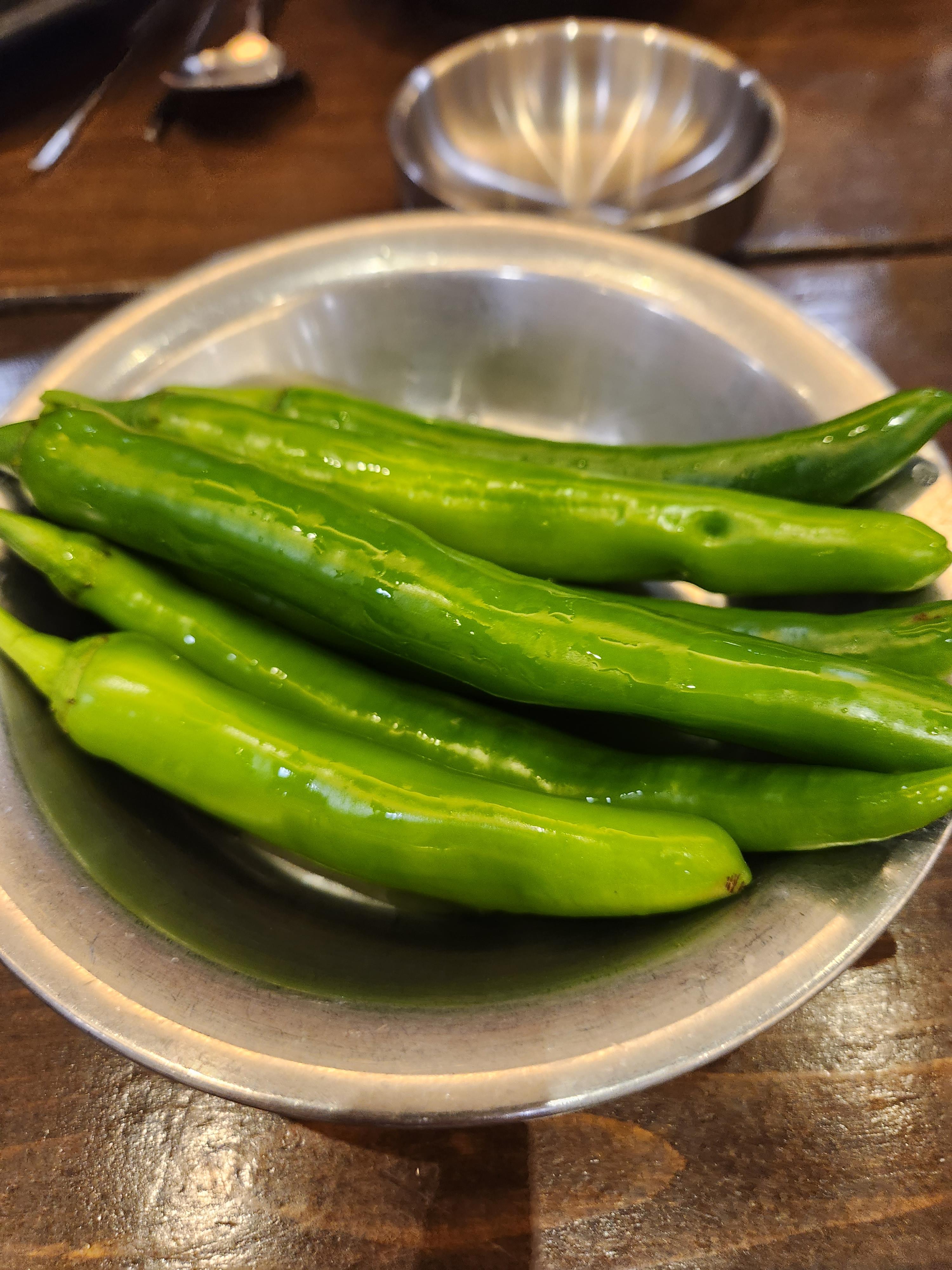 풋고추, 배추김치, 쌈장, 무생채, 땅콩조림이