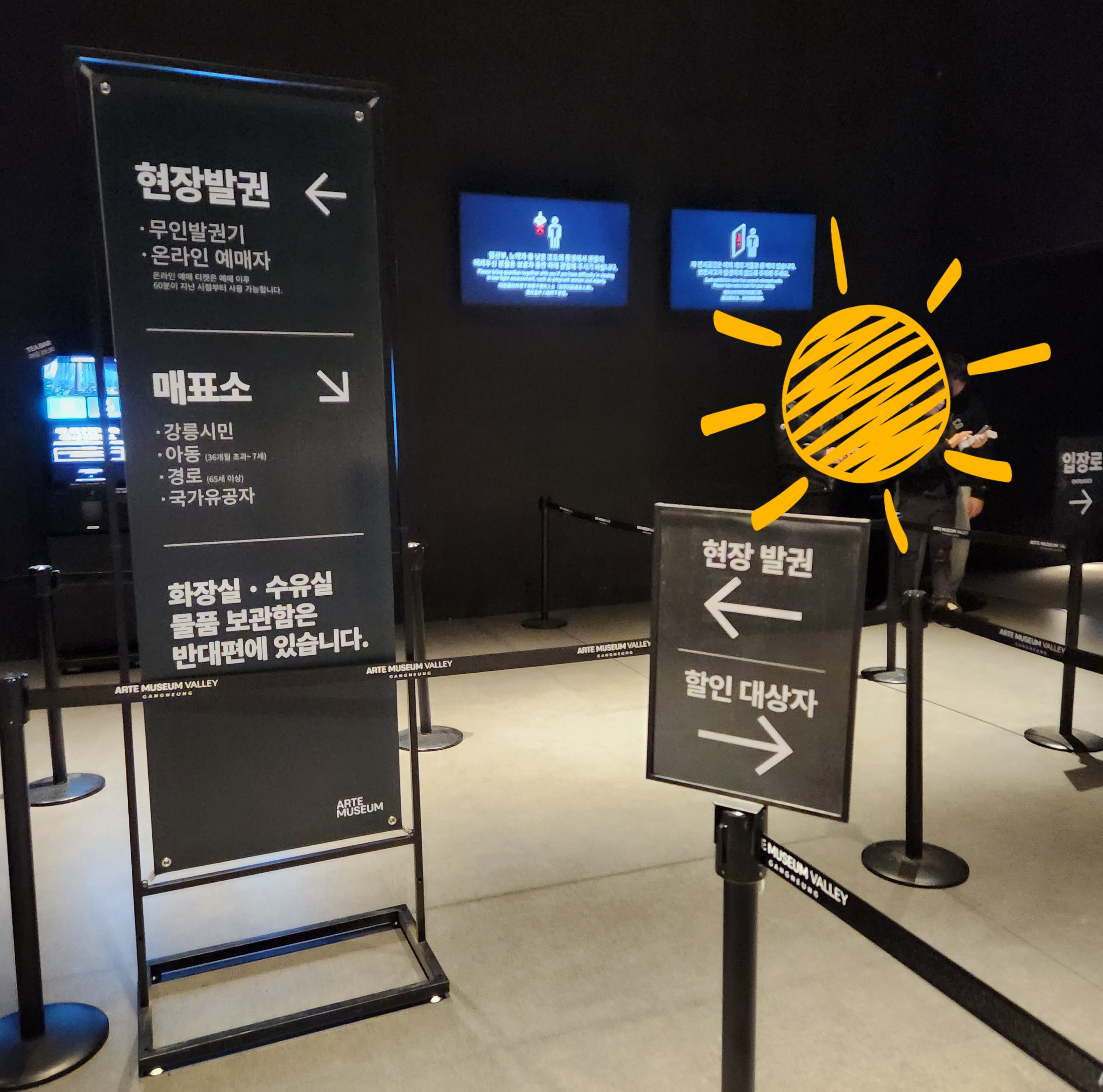 입구에 들어서면 현장발권, 온라인예매자 안내표지판이 있다.